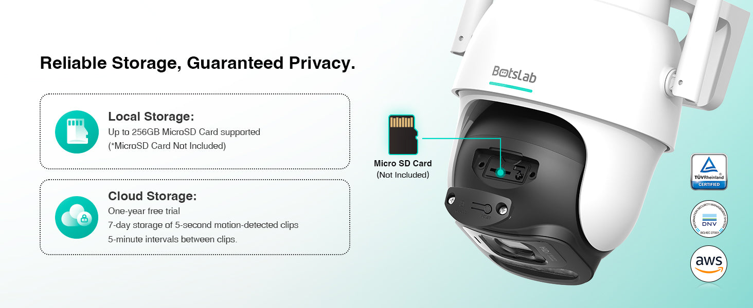 You can secure your recorded videos on a local micro SD card of up to 256 GB (not included), NVR (Onvif/RSTP) or Botslab Cloud.