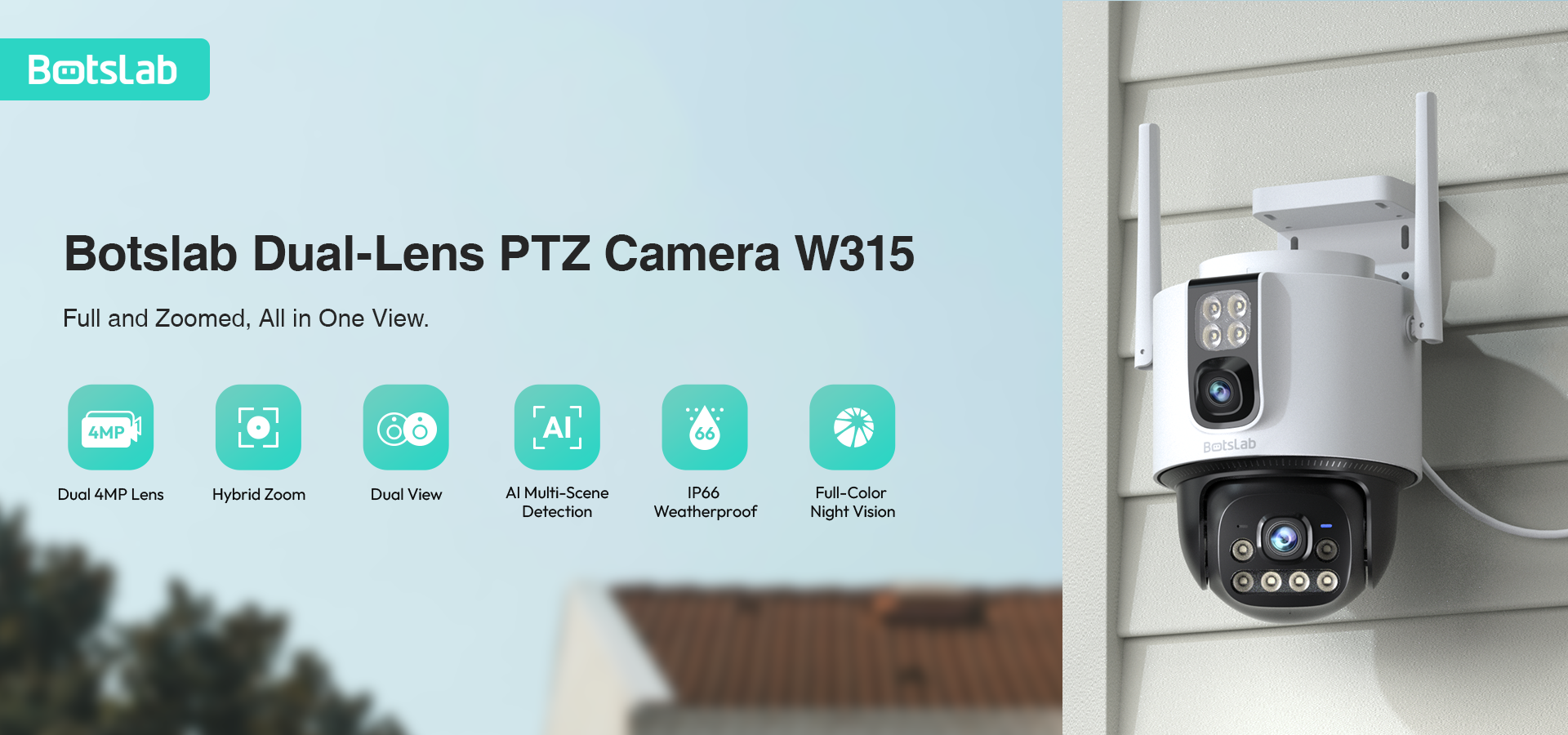 The W315 features dual 4MP cameras—a fixed lens and a rotating PTZ lens—for simultaneous dual-view monitoring.
