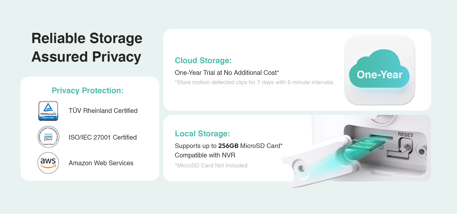 The W315 supports local storage via up to 256GB MicroSD card (not included) and offers a one-year free cloud storage trial for motion-detected clips.