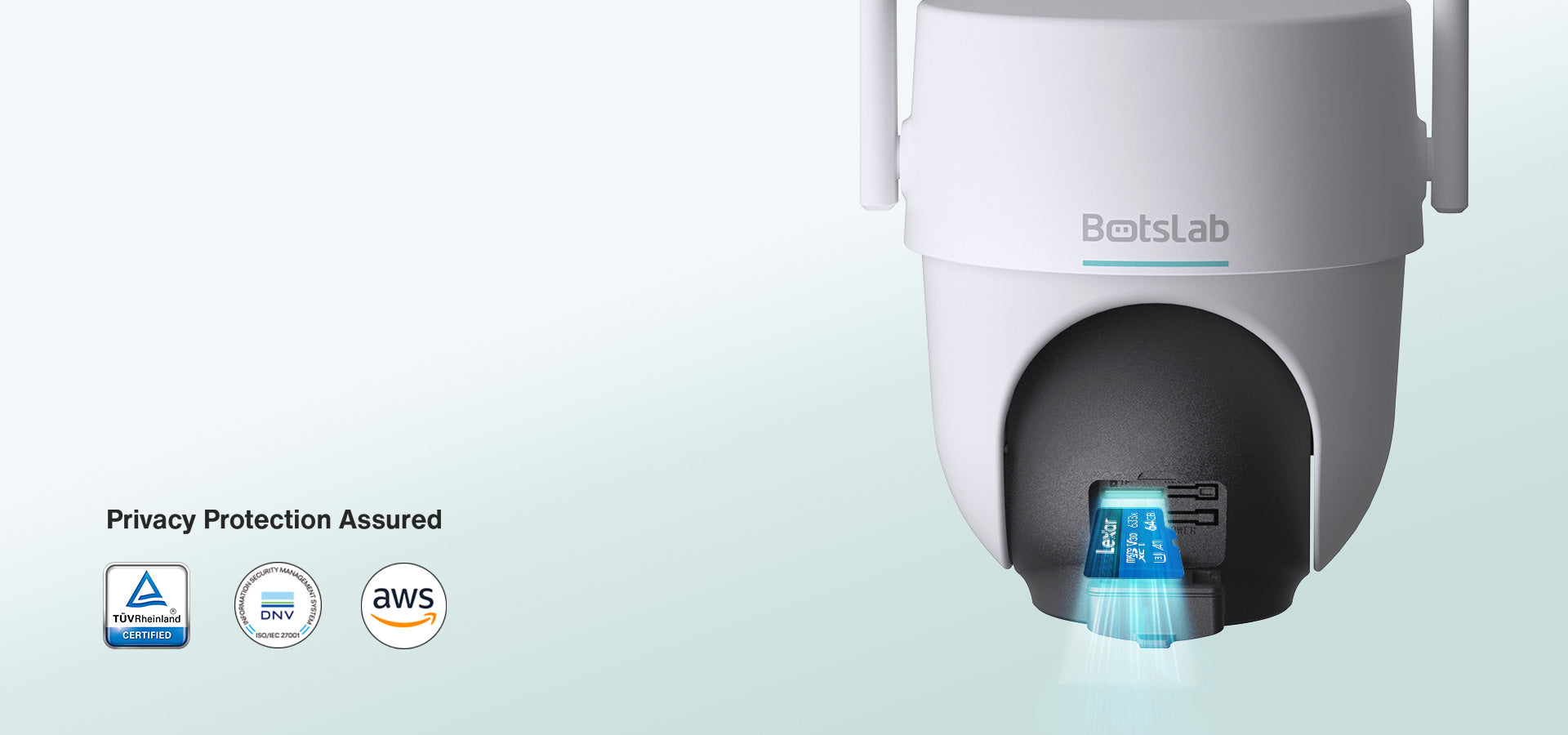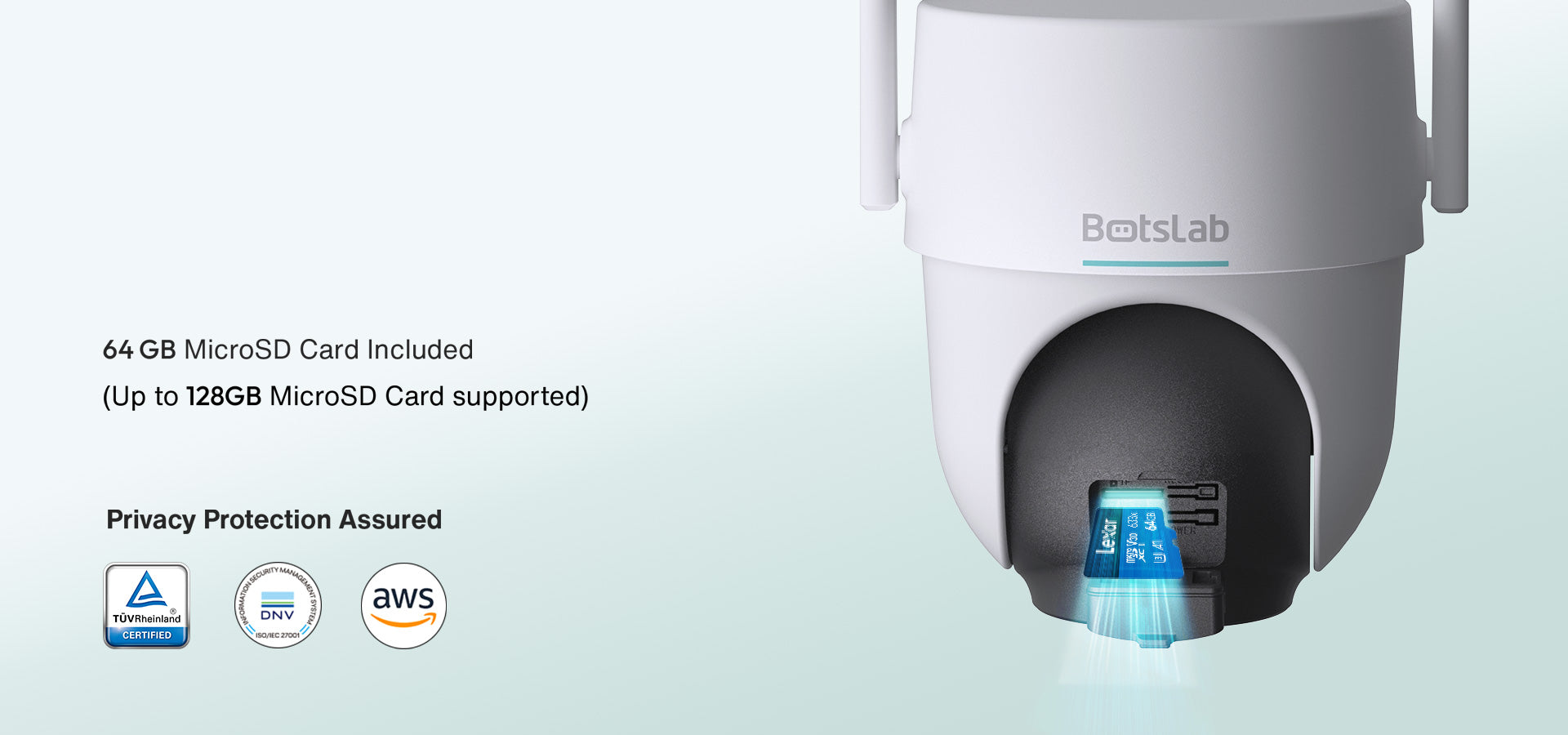 The camera supports local storage with a 64GB MicroSD card included (supports up to 128GB) and provides secure data privacy certifications.