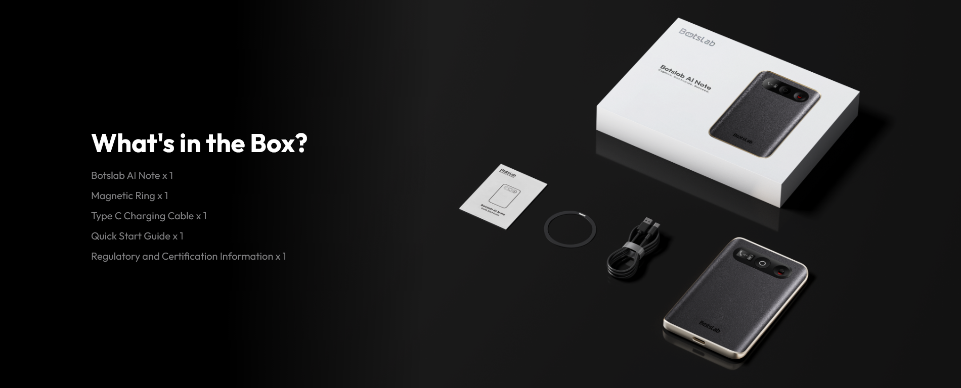 | Bundle Includes | 1 × Botslab AI Note Taker, 1 × Botslab 4-Channel 4K Dash Cam Kit, power/hardwire kit, mounting accessories |