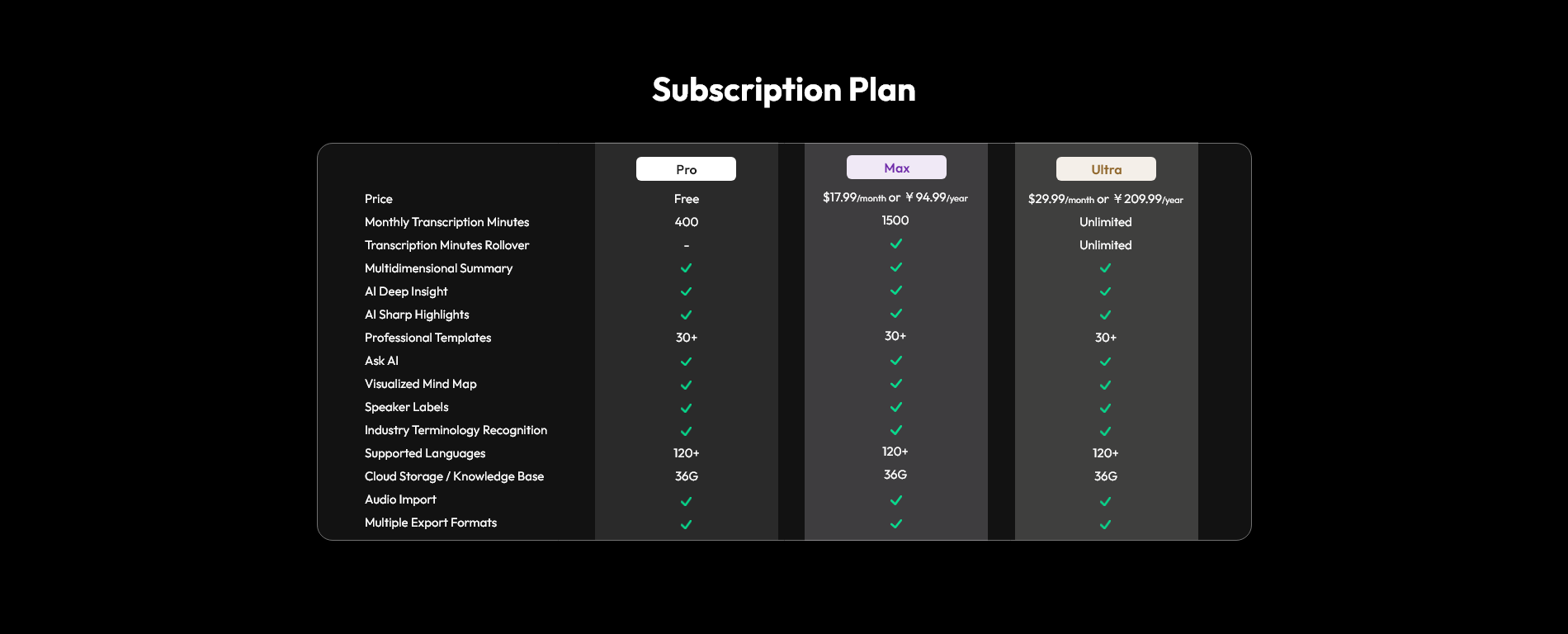 | AI Note Taker | 4-array mics, real-time transcription, export to Markdown/Word, up to 10 hrs battery |